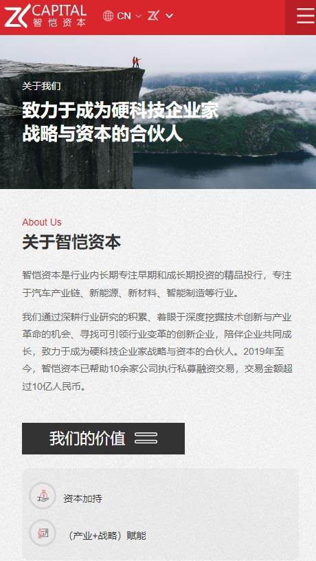 智恺资本官网设计独具匠心,以红色为主打,辅以灰、白、黑三色,既彰显企业活力与创新,又不失稳重与专业。红色主调引人注目,凸显品牌热情与前瞻;辅色则平衡视觉,营造现代简洁感。官网布局清晰,导航便捷,用户能迅速获取所需信息。