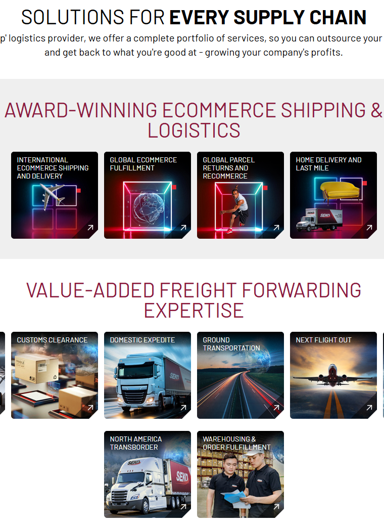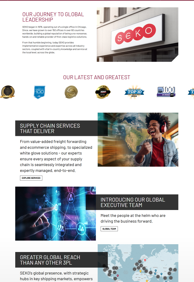 在首页设计上,SEKO Logistics注重突出公司的核心优势和服务理念。通过展示公司的服务内容、行业解决方案、客户案例等信息,让用户快速了解公司的服务实力和专业水平。同时,首页还采用了动态效果和高质量的图片,提升用户的视觉体验。在导航栏设计上,SEKO Logistics注重清晰明了,方便用户快速找到所需信息。