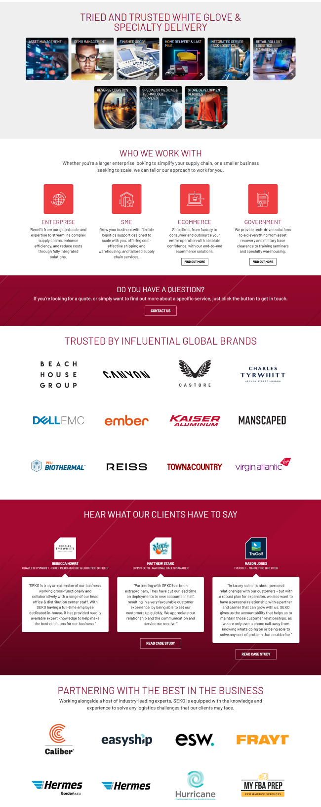 信息丰富:网站提供了详细的服务内容、行业解决方案、客户案例等信息,便于客户快速了解SEKO Logistics的服务优势。布局清晰:网站布局合理,导航栏清晰明了,方便用户快速找到所需信息。视觉效果好:网站采用了高质量的图片和动态效果,提升了用户的视觉体验。