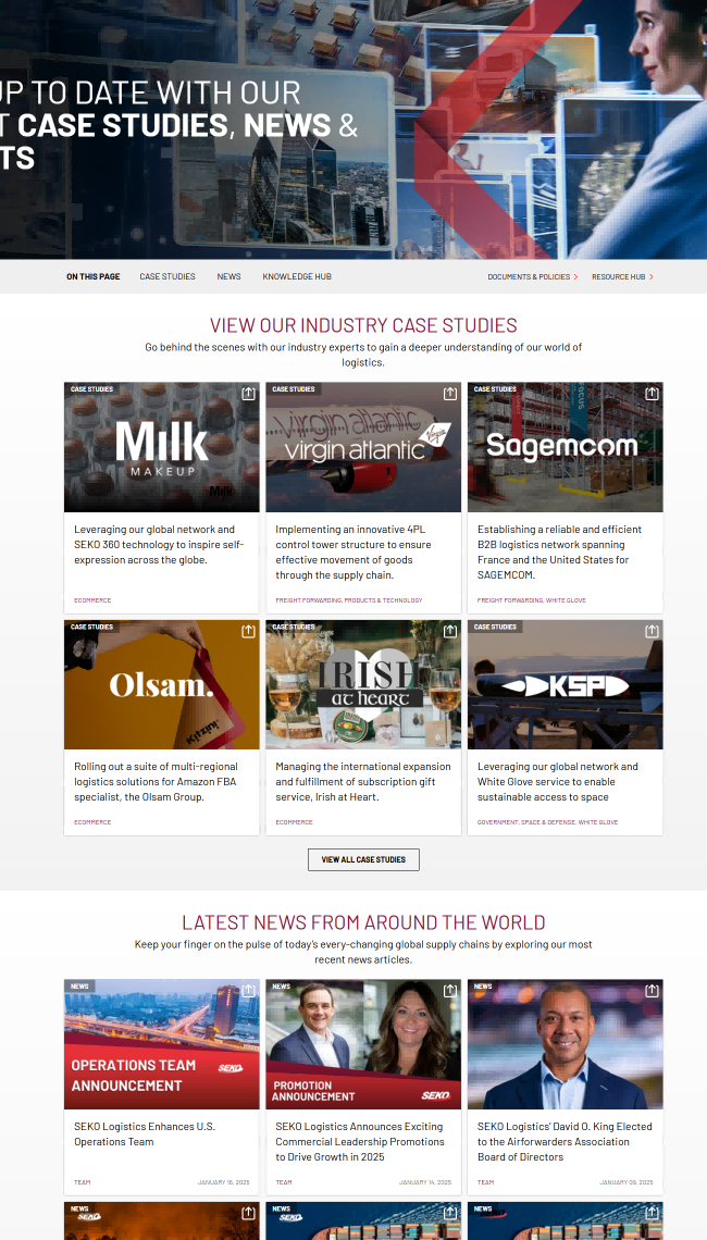 SEKO Logistics的网站针对不同类型的客户群体进行了精准定位。在首页上突出了时尚零售、电子商务、医疗、高科技等重点服务领域,便于相关行业的客户快速找到适合自己的解决方案。同时,网站还提供了客户案例、行业资讯等内容,帮助客户更好地了解SEKO Logistics的服务实力和行业影响力。