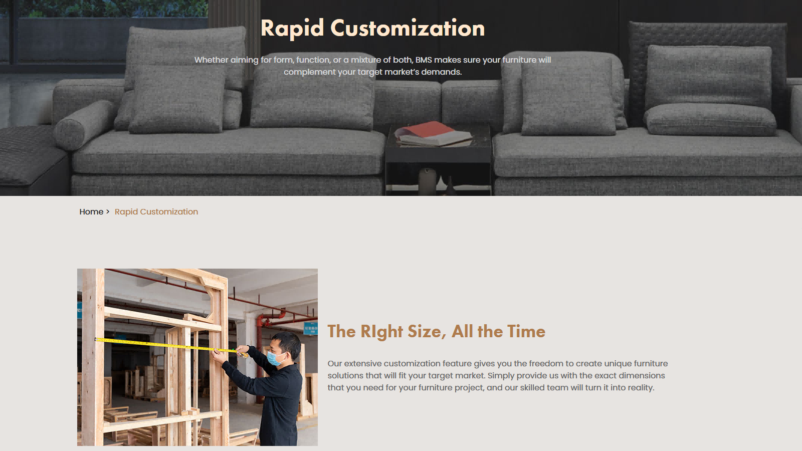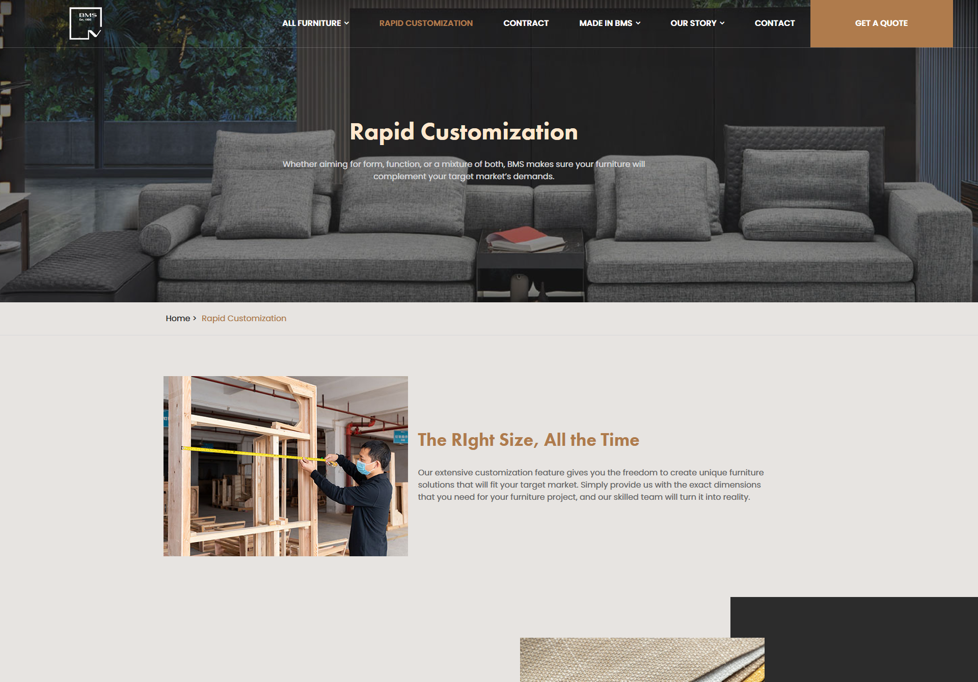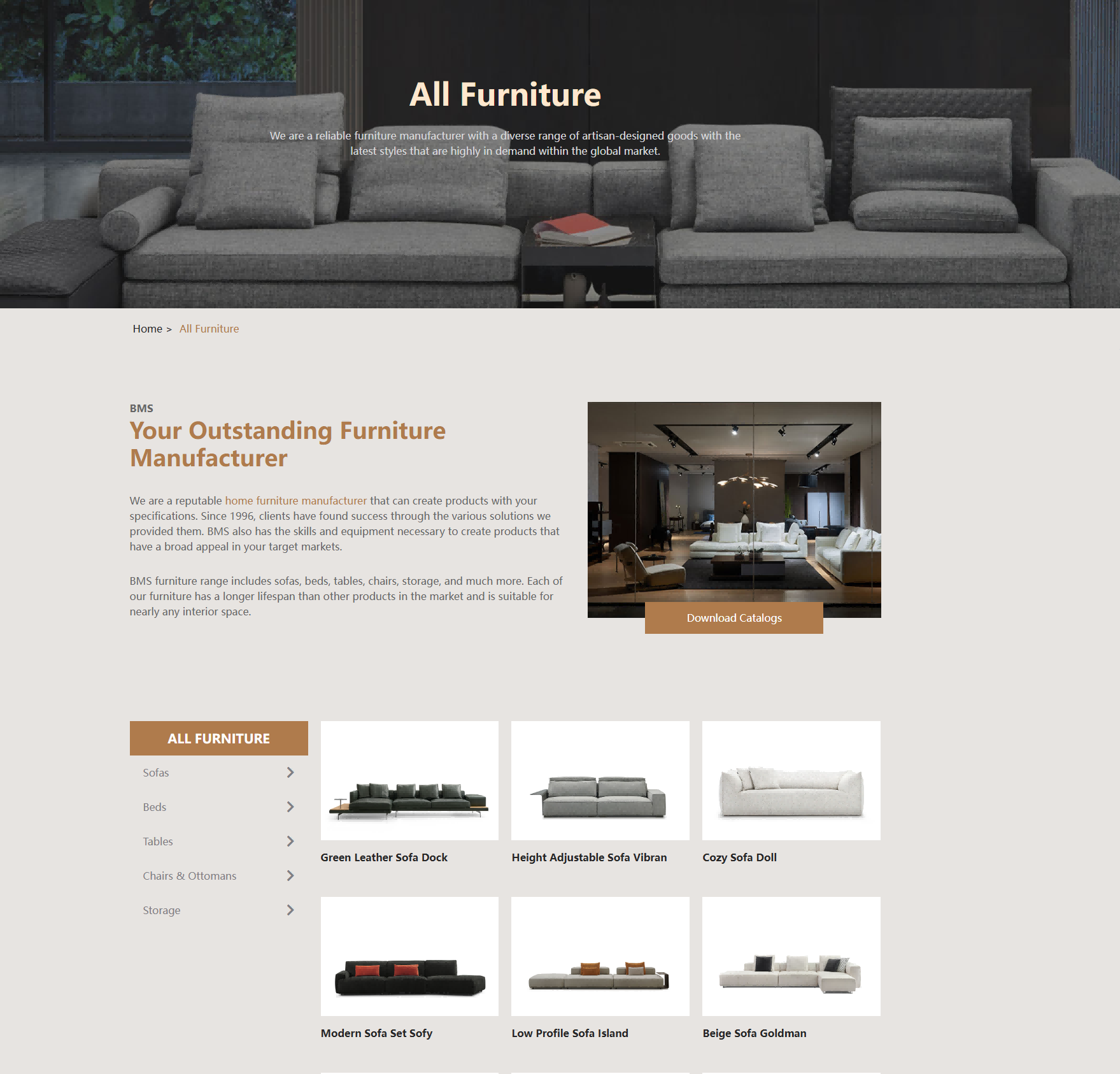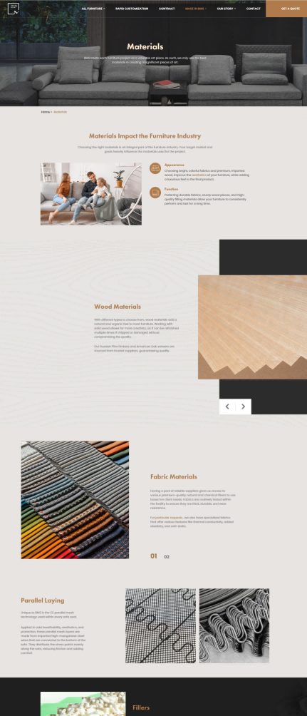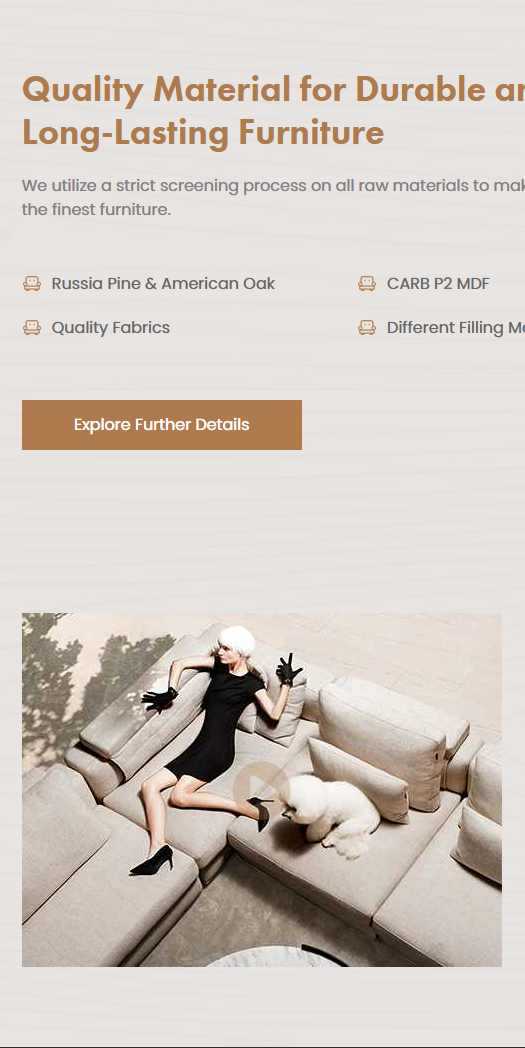 产品分类详细:在首页清晰列出了沙发、床、桌椅、储物等主要家具品类,并进一步细分如布艺沙发、组合沙发、角沙发等,方便用户快速定位到自己感兴趣的产品类型,提高了信息查找的效率。突出品质优势:详细介绍了原材料的选用,包括木材、板材、面料及填充材料等方面的严格筛选过程,增强了用户对产品质量的信任度。