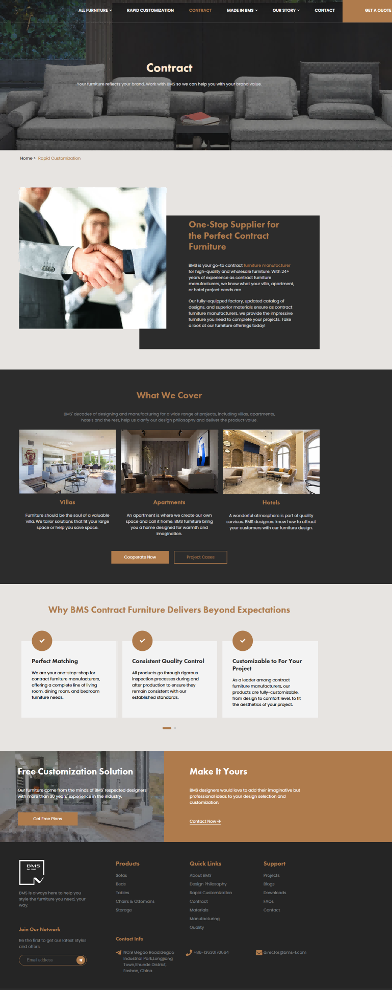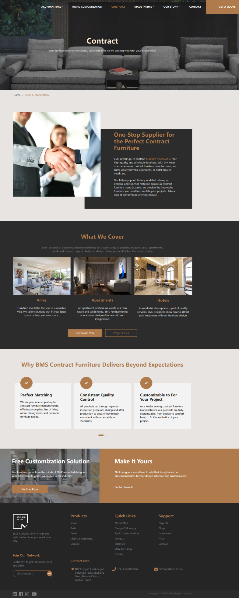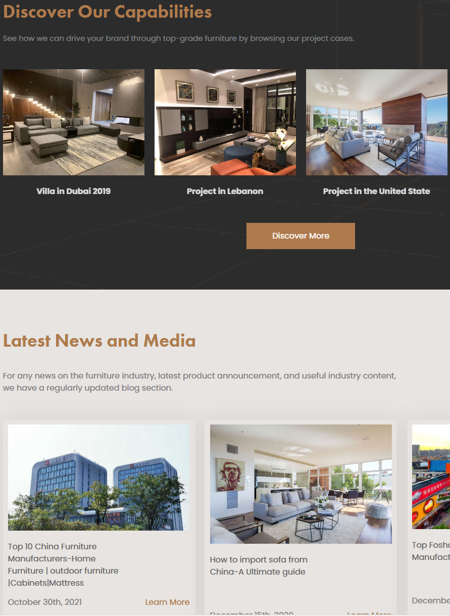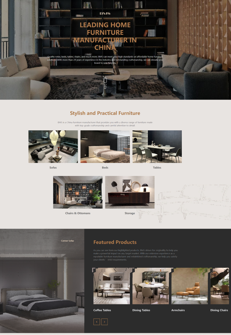视觉方面:产品图片拍摄精美,多角度展示家具的外观和细节,搭配白色背景,凸显产品的质感与设计感,塑造了高端、精致的品牌形象。页面布局规整,各板块划分明确,如产品分类、特色产品、项目案例等,使用户在浏览时能够快速获取信息,感受到专业与有序。 交互方面:在产品展示区域设置了点击查看详情的交互功能,方便用户深入了解产品信息;在页面底部设置了 “Join Our Network” 等引导用户参与的按钮,促进用户与公司的进一步联系。