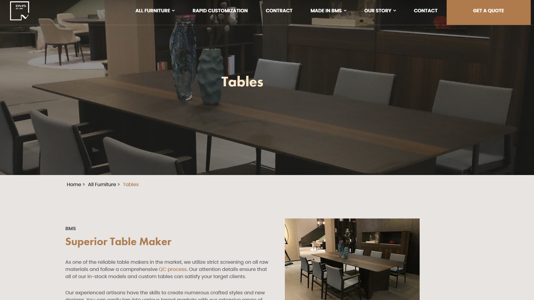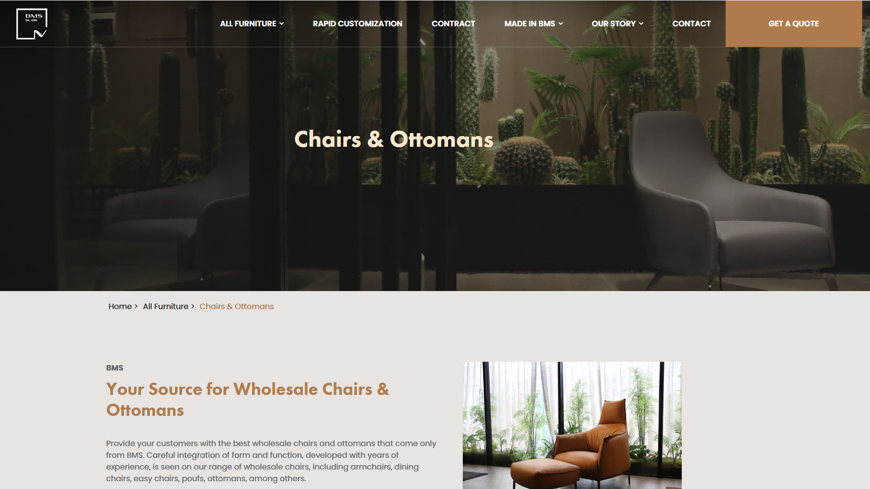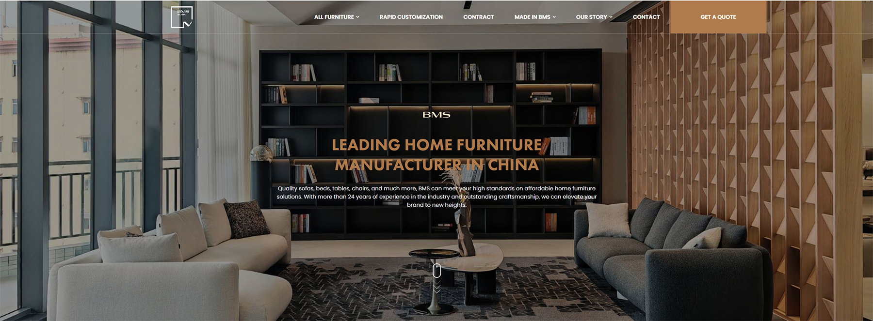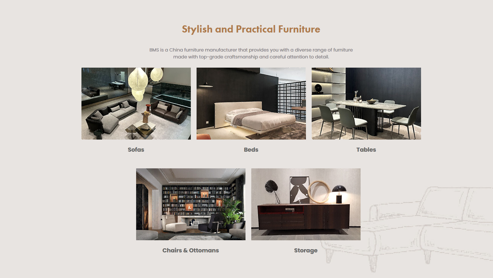 视觉方面:产品图片拍摄精美,多角度展示家具的外观和细节,搭配白色背景,凸显产品的质感与设计感,塑造了高端、精致的品牌形象。页面布局规整,各板块划分明确,如产品分类、特色产品、项目案例等,使用户在浏览时能够快速获取信息,感受到专业与有序。 交互方面:在产品展示区域设置了点击查看详情的交互功能,方便用户深入了解产品信息;在页面底部设置了 “Join Our Network” 等引导用户参与的按钮,促进用户与公司的进一步联系。