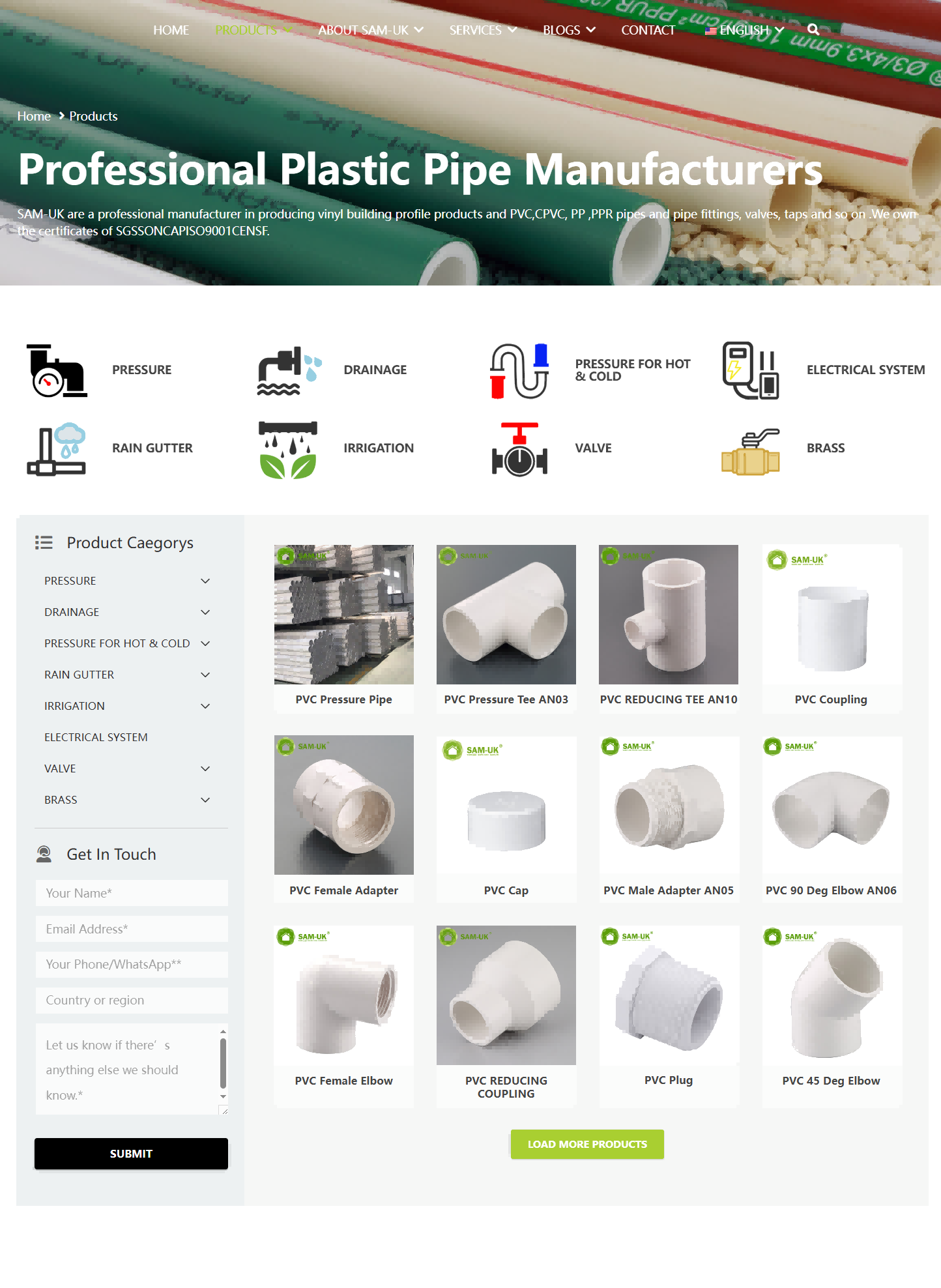 网站旨在全面展示 SAM - UK 的塑料管材管件产品系列、强大的生产实力与优质的服务优势。通过详细的产品分类介绍、企业规模与认证展示、技术和售后等服务说明,向全球客户传递专业可靠的品牌形象,吸引潜在客户合作,为其提供管道系统解决方案,从而提升品牌在塑料建材行业的知名度与影响力,促进产品销售与市场拓展。