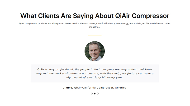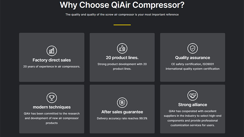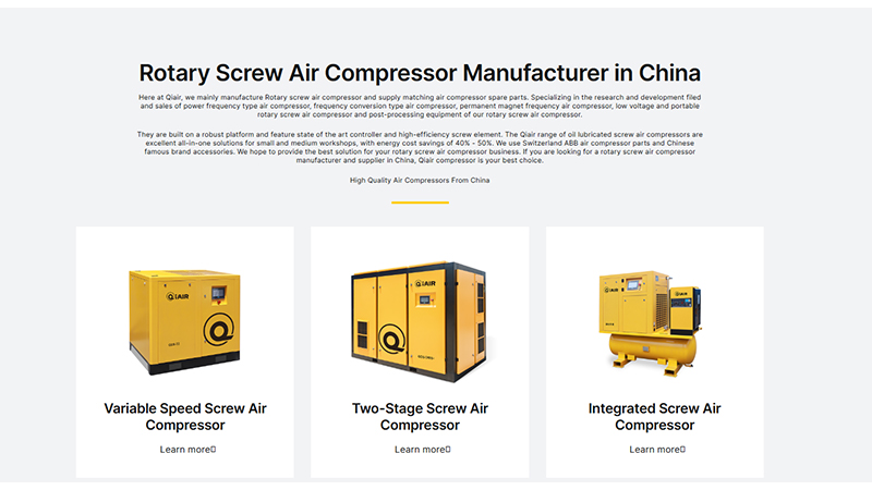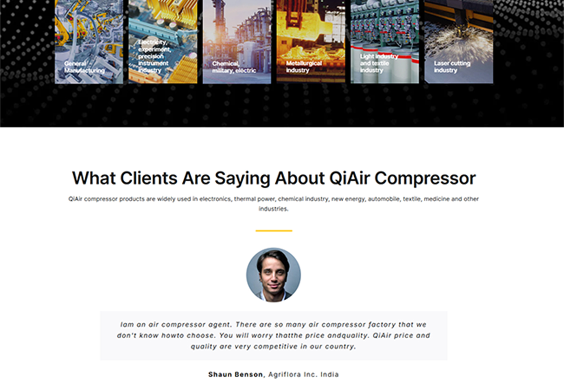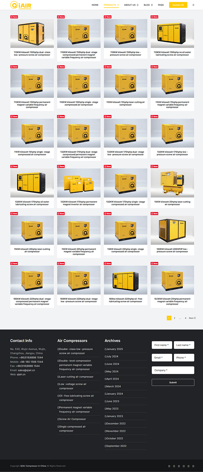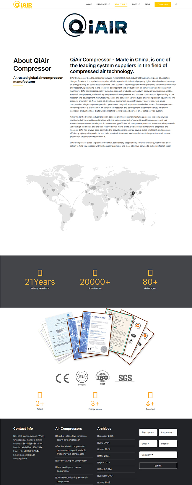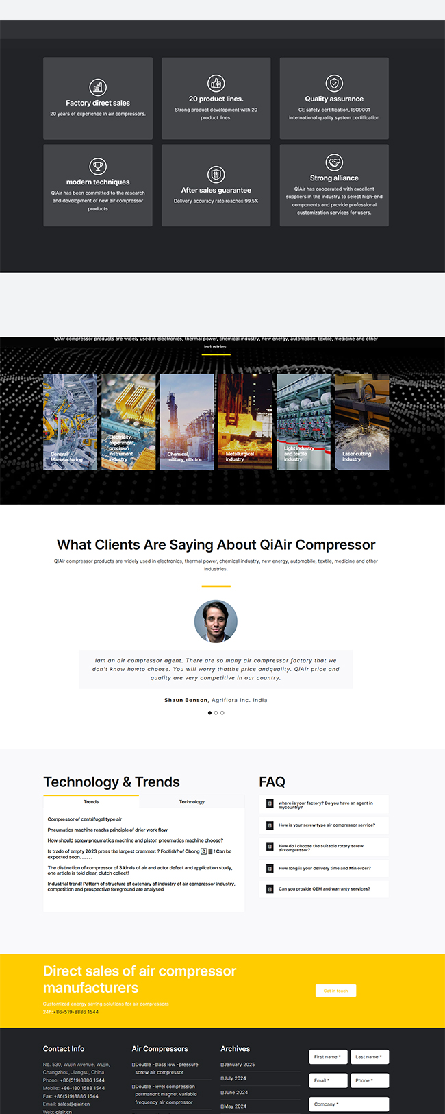 网站风格定位为现代工业风,以简洁、实用和专业为主要特点。网站采用清晰的布局和直观的导航,确保用户能够快速获取关键信息。图文并茂的内容展示方式增强了视觉吸引力,同时运用动态效果和交互设计,提升用户体验。网站风格统一,兼具工业感与科技感,完美契合公司作为空气压缩机制造商的定位。