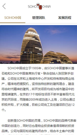 SOHO中国,中国房地产行业领袖企业,北京、上海最大的办公楼开发商,坚持独特创新的建筑理念,建造符合时代精神的建筑。